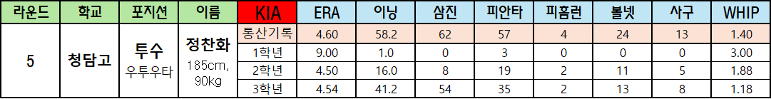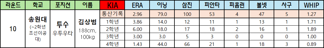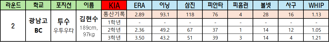 | 라운드 | 학교 | 포지션 | 이름 | KIA | ERA | 이닝 | 삼진 | 피안타 | 피홈런 | 볼넷 | 사구 | WHIP |
