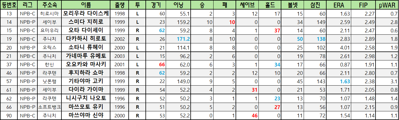| 등번호 | 리그 | 주소속 | 이름 | 출생 | 투 | 경기 | 이닝 | 승 | 패 | 세이브 | 홀드 | 볼넷 | 삼진 | ERA | FIP | pWAR |