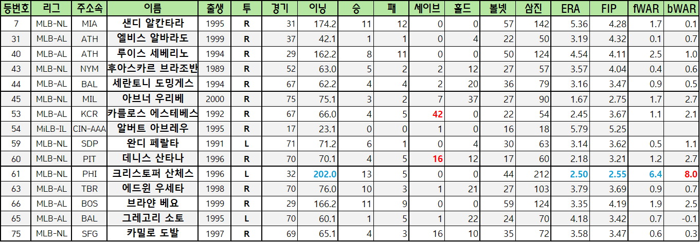 | 44 | MLB-AL | BAL | 세란토니 도밍게스 | 1994 | R | 67 | 62.2 | 4 | 4 | 2 | 20 | 36 | 79 | 3.16 | 3.47 | 0.9 | 0.5 |