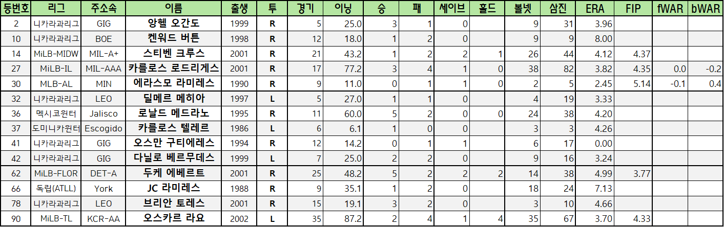 | 등번호 | 리그 | 주소속 | 이름 | 출생 | 투 | 경기 | 이닝 | 승 | 패 | 세이브 | 홀드 | 볼넷 | 삼진 | ERA | FIP | fWAR | bWAR |