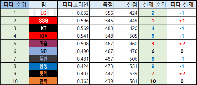 간단한 설명은 자료 아래에 적겠습니다. 두 표는 같은 내용입니다.! 피타-순위 팀 피타고리안 득점 실점 실제-순위 피타-실제 1 SSG 0.614 439 348 1 0 2 LG 0.613 444 353 3 -1 3 키움 0.574 383 330 2 +1 4 KIA..