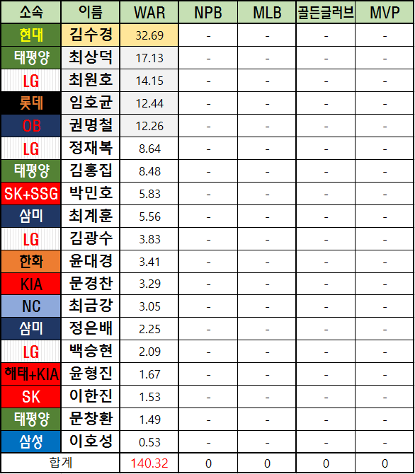 메이저리그 WAR은 bWAR와 fWAR의 평균값으로 표기했습니다.