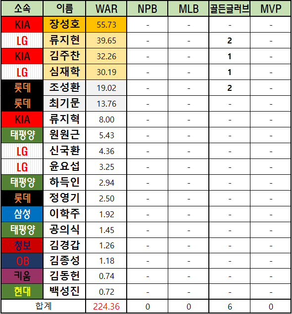 소속팀 표기는 스탯티즈 표기에 따라 많은 WAR을 기록한 팀으로 정하였습니다.