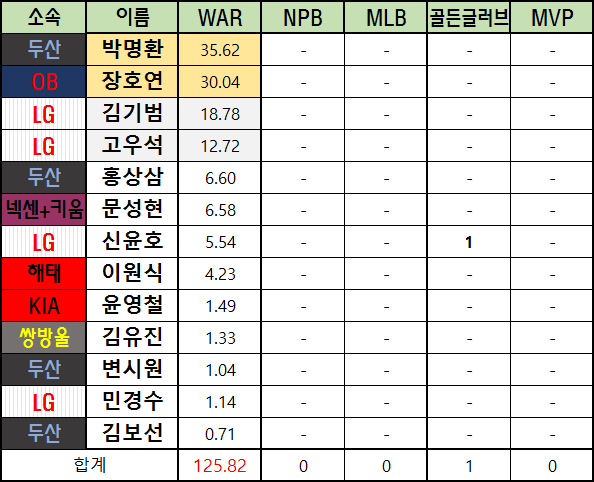 | LG | 윤요섭 | 3.25 | - | - | - | - |