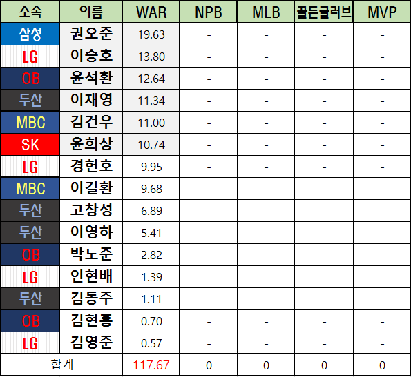 | OB | 김우열 | 11.64 | - | - | - | - |