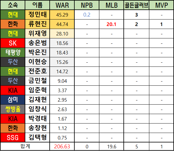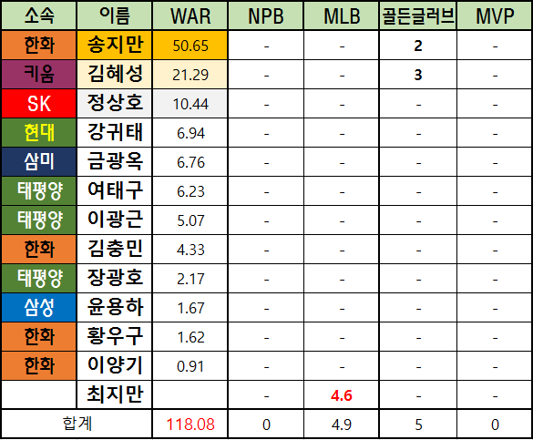 메이저리그 WAR은 bWAR와 fWAR의 평균값으로 표기했습니다.