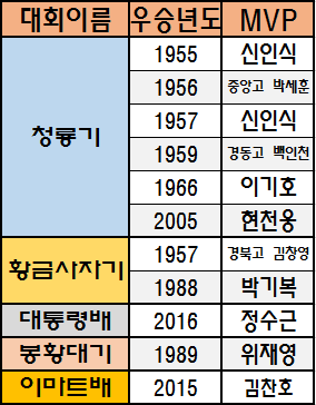 출신 야구선수들의 WAR의 총합이 80이 넘는 고등학교들을 나열해 보았습니다. (누락된 학교는 추가해 나가겠습니다.) 대회우승은 '청룡기, 황금사자기, 대통령배, 봉황대기, 이마트배(전 협회장기