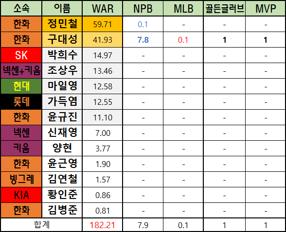 메이저리그 WAR은 bWAR와 fWAR의 평균값으로 표기했습니다.