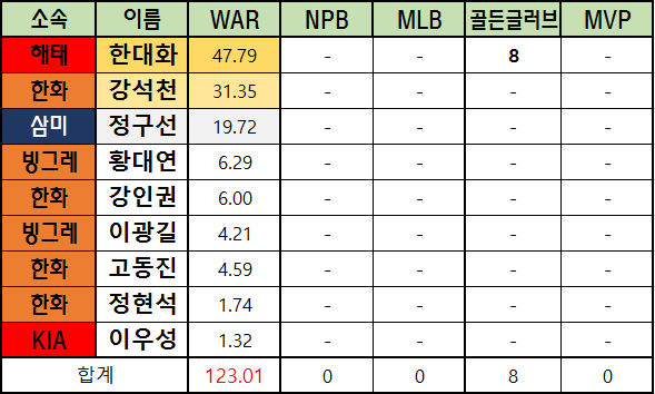 메이저리그 WAR은 bWAR와 fWAR의 평균값으로 표기했습니다.