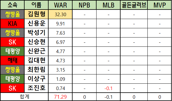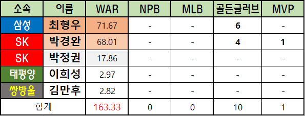 메이저리그 WAR은 bWAR와 fWAR의 평균값으로 표기했습니다.