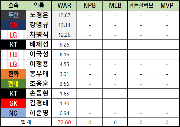 메이저리그 WAR은 bWAR와 fWAR의 평균값으로 표기했습니다.