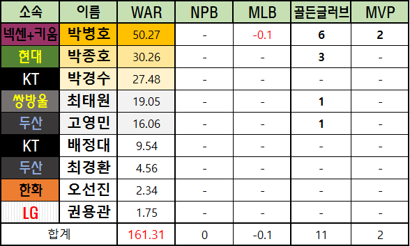 메이저리그 WAR은 bWAR와 fWAR의 평균값으로 표기했습니다.