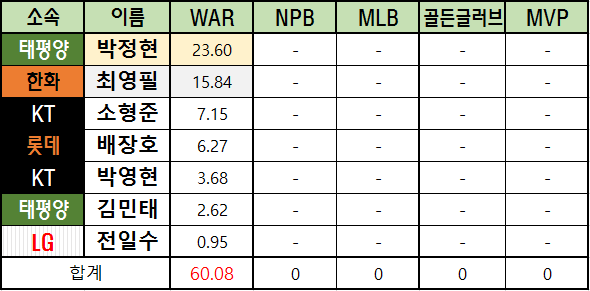 메이저리그 WAR은 bWAR와 fWAR의 평균값으로 표기했습니다.
