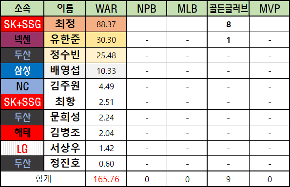 | SK+SSG | 최정 | 88.37 | - | - | 8 | - |