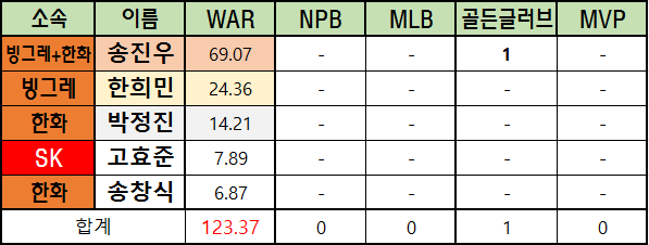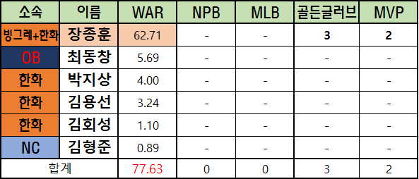 메이저리그 WAR은 bWAR와 fWAR의 평균값으로 표기했습니다.