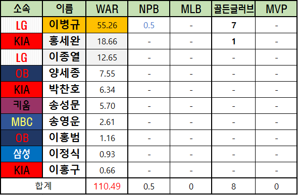 | LG | 이병규 | 55.26 | 0.5 | - | 7 | - |