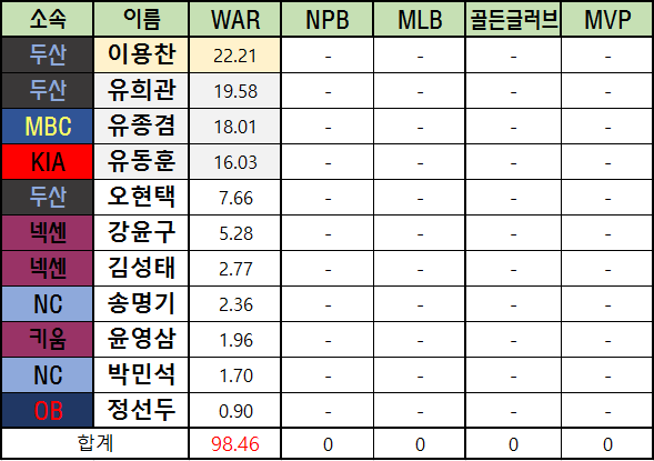 메이저리그 WAR은 bWAR와 fWAR의 평균값으로 표기했습니다.