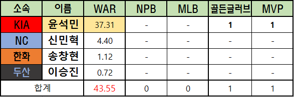메이저리그 WAR은 bWAR와 fWAR의 평균값으로 표기했습니다.