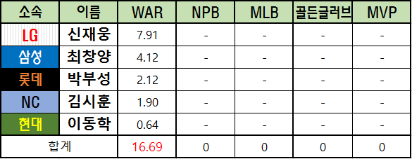 | 소속 | 이름 | WAR | NPB | MLB | 골든글러브 | MVP |
