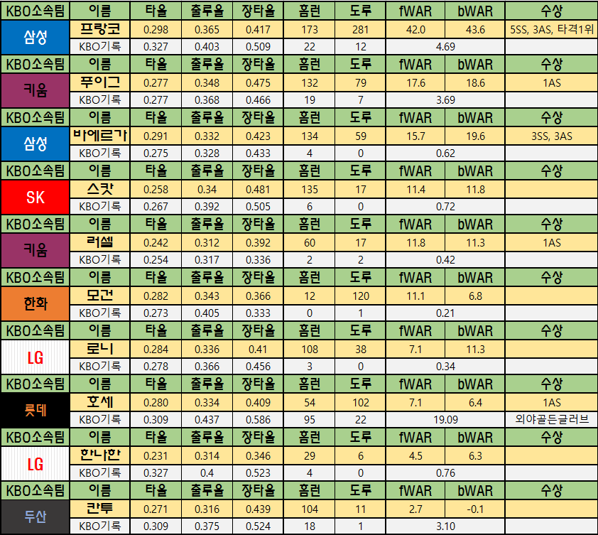 | KBO소속팀 | 이름 | 타율 | 출루율 | 장타율 | 홈런 | 도루 | fWAR | bWAR | 수상 |