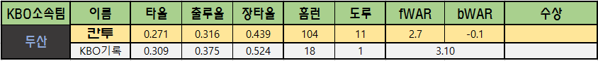 | 두산 | 칸투 | 0.271 | 0.316 | 0.439 | 104 | 11 | 2.7 | -0.1 | |
