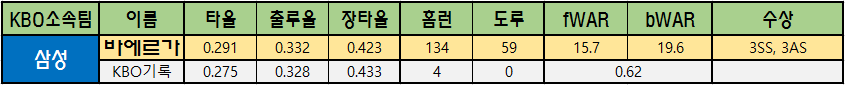| 삼성 | 바에르가 | 0.291 | 0.332 | 0.423 | 134 | 59 | 15.7 | 19.6 | 3SS, 3AS |