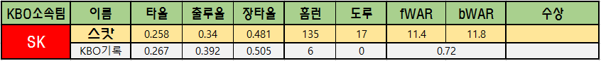 | SK | 스캇 | 0.258 | 0.34 | 0.481 | 135 | 17 | 11.4 | 11.8 | |