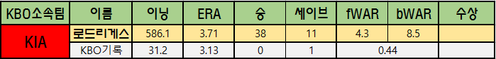 | KIA | 로드리게스 | 586.1 | 3.71 | 38 | 11 | 4.3 | 8.5 | |