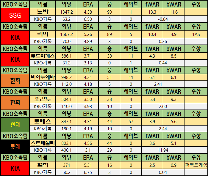 | KBO소속팀 | 이름 | 이닝 | ERA | 승 | 세이브 | fWAR | bWAR | 수상 |