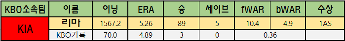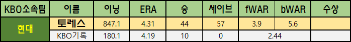 | KBO기록 | 180.1 | 4.19 | 10 | 0 | 2.44 | |||