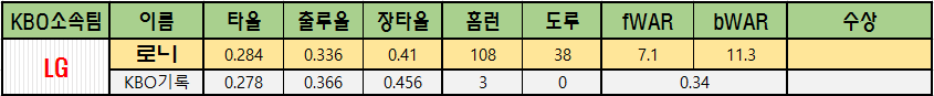| LG | 로니 | 0.284 | 0.336 | 0.41 | 108 | 38 | 7.1 | 11.3 | |