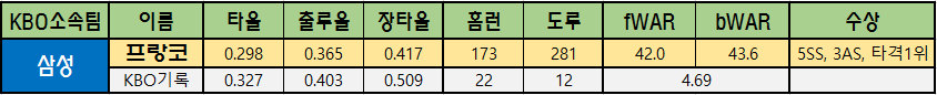 | 삼성 | 프랑코 | 0.298 | 0.365 | 0.417 | 173 | 281 | 42.0 | 43.6 | 5SS, 3AS, 타격1위 |
