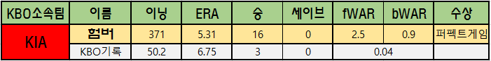 | KIA | 험버 | 371 | 5.31 | 16 | 0 | 2.5 | 0.9 | 퍼펙트게임 |