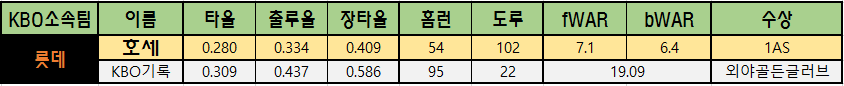 | 롯데 | 호세 | 0.280 | 0.334 | 0.409 | 54 | 102 | 7.1 | 6.4 | 1AS |