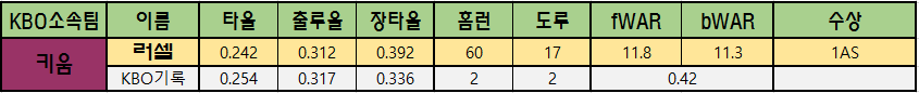 | 키움 | 러셀 | 0.242 | 0.312 | 0.392 | 60 | 17 | 11.8 | 11.3 | 1AS |