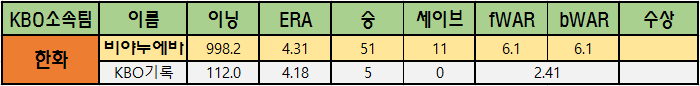 | KBO기록 | 112.0 | 4.18 | 5 | 0 | 2.41 | |||