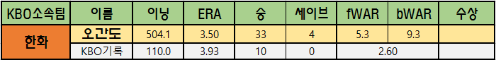 | 한화 | 오간도 | 504.1 | 3.50 | 33 | 4 | 5.3 | 9.3 | |
