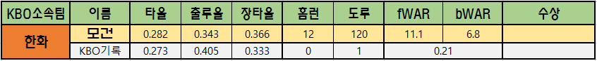 | 한화 | 모건 | 0.282 | 0.343 | 0.366 | 12 | 120 | 11.1 | 6.8 | |