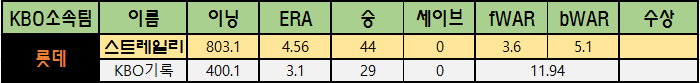 | 롯데 | 스트레일리 | 803.1 | 4.56 | 44 | 0 | 3.6 | 5.1 | |