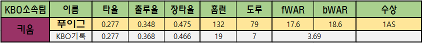 | 키움 | 푸이그 | 0.277 | 0.348 | 0.475 | 132 | 79 | 17.6 | 18.6 | 1AS |