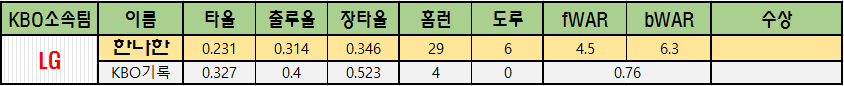 | LG | 한나한 | 0.231 | 0.314 | 0.346 | 29 | 6 | 4.5 | 6.3 | |