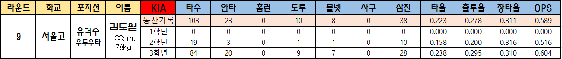 | 라운드 | 학교 | 포지션 | 이름 | KIA | 타수 | 안타 | 홈런 | 도루 | 볼넷 | 사구 | 삼진 | 타율 | 출루율 | 장타율 | OPS |