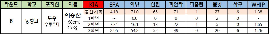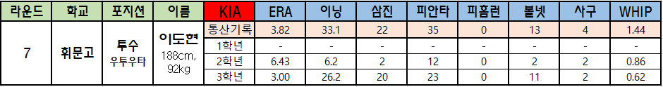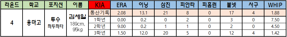 | 라운드 | 학교 | 포지션 | 이름 | KIA | ERA | 이닝 | 삼진 | 피안타 | 피홈런 | 볼넷 | 사구 | WHIP |