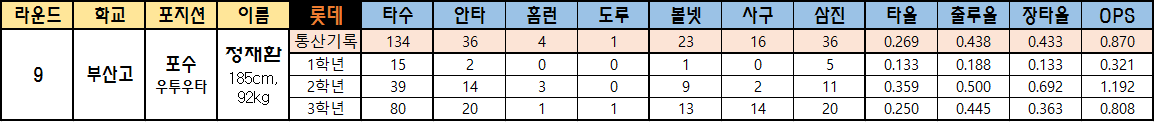 | 라운드 | 학교 | 포지션 | 이름 | 롯데 | 타수 | 안타 | 홈런 | 도루 | 볼넷 | 사구 | 삼진 | 타율 | 출루율 | 장타율 | OPS |