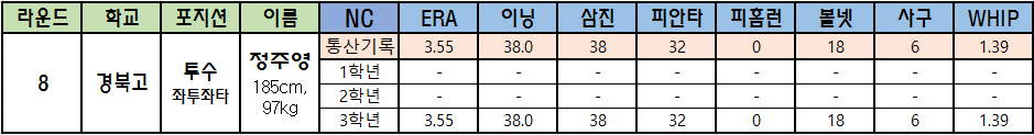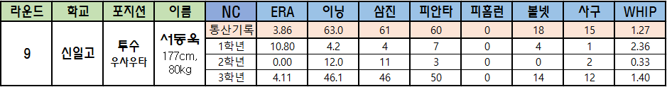 | 라운드 | 학교 | 포지션 | 이름 | NC | ERA | 이닝 | 삼진 | 피안타 | 피홈런 | 볼넷 | 사구 | WHIP |