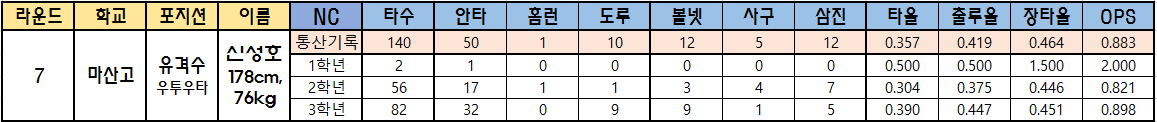 | 라운드 | 학교 | 포지션 | 이름 | NC | 타수 | 안타 | 홈런 | 도루 | 볼넷 | 사구 | 삼진 | 타율 | 출루율 | 장타율 | OPS |
