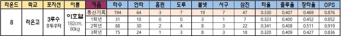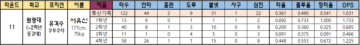 | 3학년 | 107 | 35 | 1 | 6 | 11 | 0 | 11 | 0.327 | 0.387 | 0.458 | 0.844 |