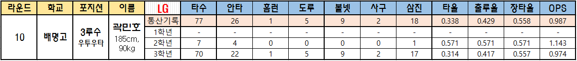 | 라운드 | 학교 | 포지션 | 이름 | LG | 타수 | 안타 | 홈런 | 도루 | 볼넷 | 사구 | 삼진 | 타율 | 출루율 | 장타율 | OPS |
