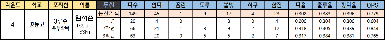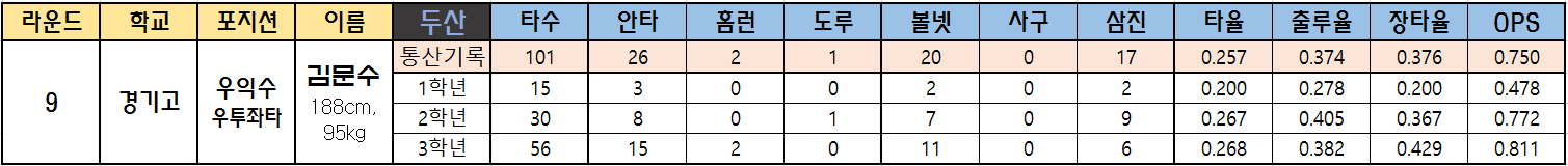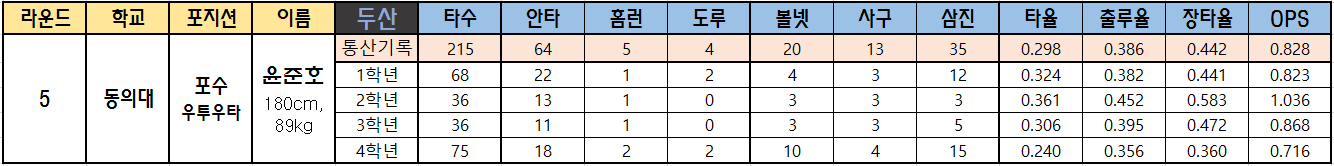 | 라운드 | 학교 | 포지션 | 이름 | 두산 | 타수 | 안타 | 홈런 | 도루 | 볼넷 | 사구 | 삼진 | 타율 | 출루율 | 장타율 | OPS |