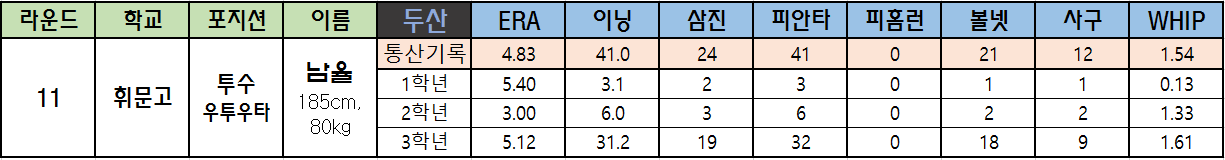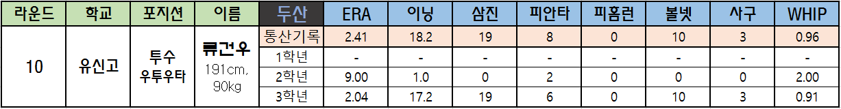 | 라운드 | 학교 | 포지션 | 이름 | 두산 | ERA | 이닝 | 삼진 | 피안타 | 피홈런 | 볼넷 | 사구 | WHIP |